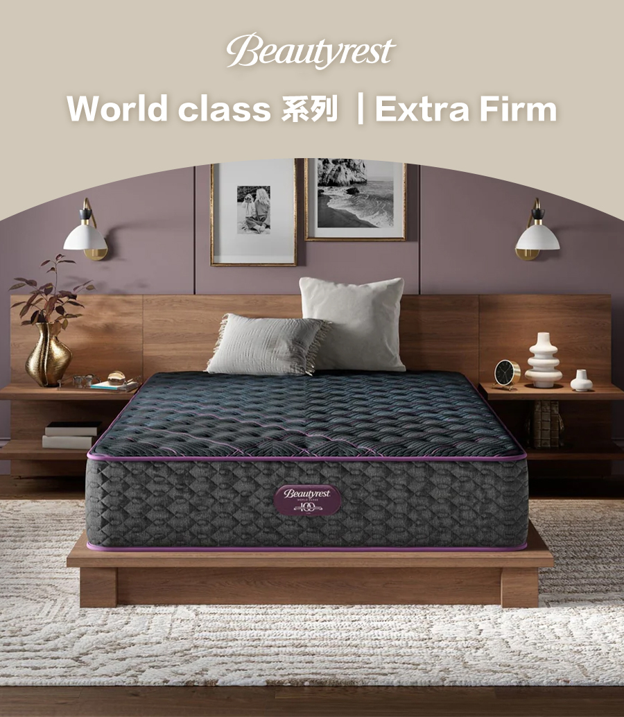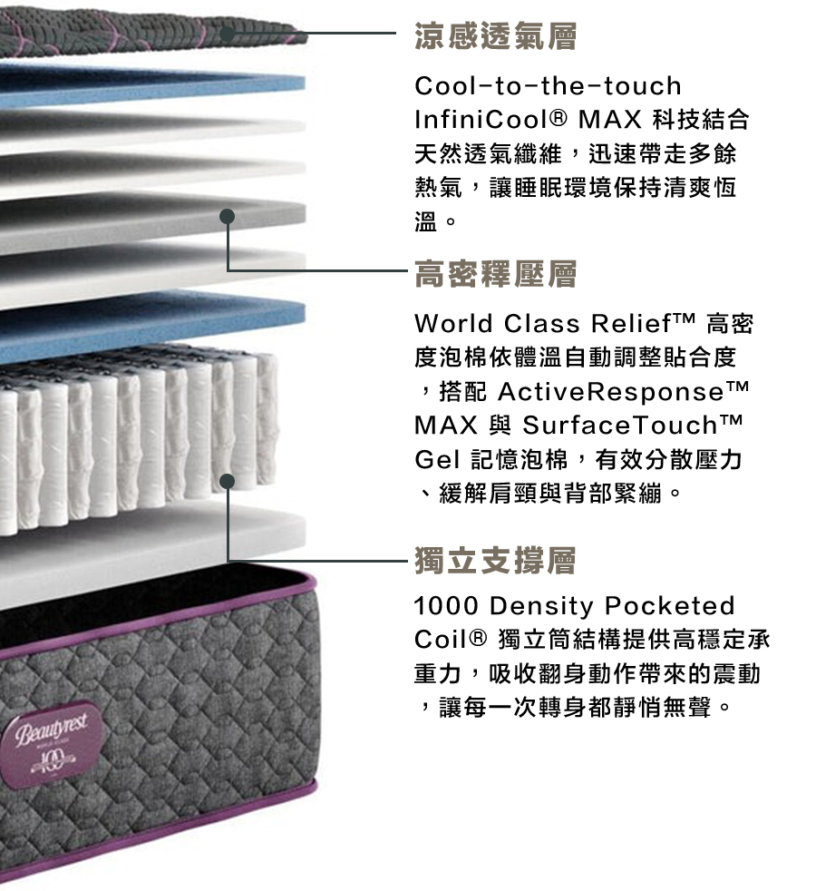 World Class Relief™ 高密度記憶泡棉依體溫貼合曲線,搭配升級版 Beautyrest® ActiveResponse™ MAX 與 SurfaceTouch™ 凝膠記憶泡棉,進一步舒緩肩頸與腰臀壓力點。